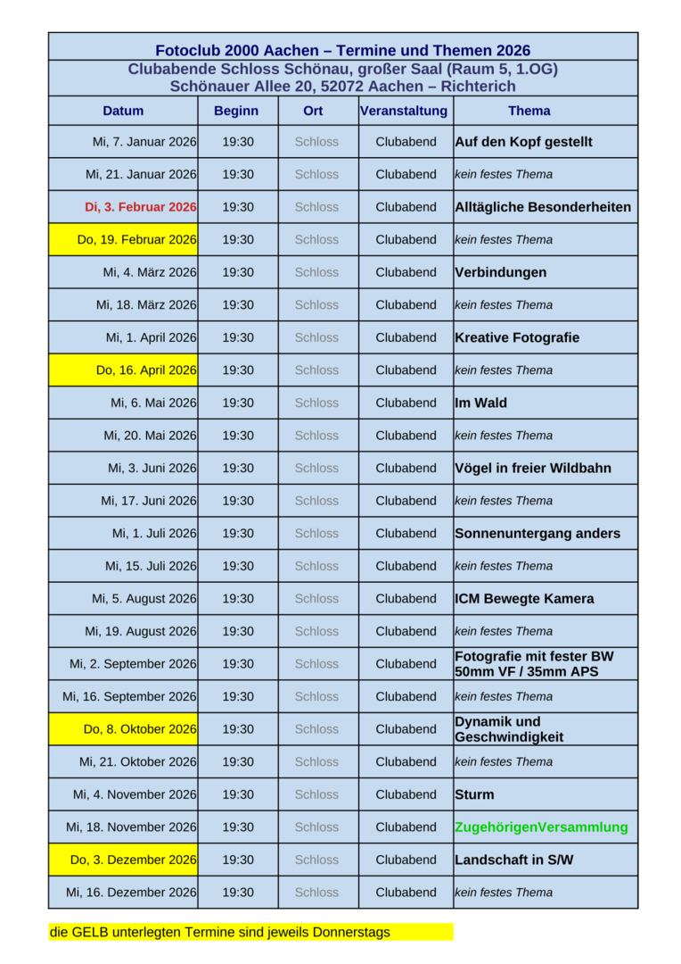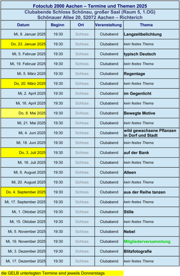 Wir treffen uns grundsätzlich zwei Mal im Monat, am 1. Mittwoch und am 3. Mittwoch jeden Monats zum Fotoclubabend in Schloss Schönau (großer Saal im 1.OG) in Aachen - Richterich, jeweils um 19.30 Uhr.
