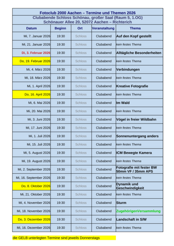 Jeder erste Clubabend im Monat steht unter einem festgelegten Thema. Der zweite Clubabend im Monat hat kein festgelegtes Thema, die Fotoclubzugehörigen können sich jeweils ein Thema auswählen zu dem